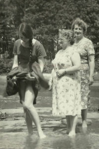 Zdjęcie czarno-białe jest z lipca 1961 roku, upalna niedziela podczas sesji egzaminów wstępnych, pojechaliśmy z ciociami i niewidocznymi na zdjęciu wujami do Świdra. Mam na sobie sukienkę z ośmiu klinów górą dopasowanych, rozszerzających się ku dołowi ze wstawianymi ośmioma godetami – idealną do charlestona, modnego 40 lat wcześniej. Tym razem z nowego materiału, czerwonej kory, którą właśnie rzucili do sklepów. No i do tego warkocz. Zamiłowanie do rozszerzających się sukienek pozostało (zdjęcie kolorowe), warkocz zmienił się w krótkie fryzury.