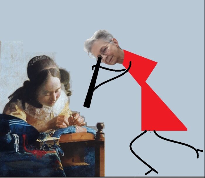 Sama wystawa to 27 dzieł Johannesa Vermeera, czyli 73% wszystkich przypisywanych mu malowideł. Zastanawiałam się czy taka monoautorska wystawa nie znudzi. Niewielka, nie miała szansy, choć gdyby była większą to może. Tematy w pewnym sensie powtarzały się. Dziewczyna spoglądająca na obserwatora raz z listem w ręku, za drugim razem z instrumentem muzycznym, albo w czerwonym kapeluszu… Te obrazy nie ujęły mnie. Zawsze uważałam, że te twarze mają w sobie coś syntetycznego. Okazuje się, że Vermeer nie portretował modeli, lecz malował z pamięci. Na wielu obrazach powtarzało się tło, ale to mi nie przeszkadzało. Często postacie usytuowane były w tym samym pomieszczeniu, tylko raz na ścianie naprzeciw widza namalowany był obraz w obrazie, innym razem kotara, a to znów pusta ściana, a okno po lewej raz było z witrażem, tym bądź innym, raz bez. Zafascynowały mnie natomiast te dzieła, na których kobiety czymś się zajmują: pisząca list, wyrabiająca ciasto (mleczarka), najbardziej koronczarka (spójrz powyżej).