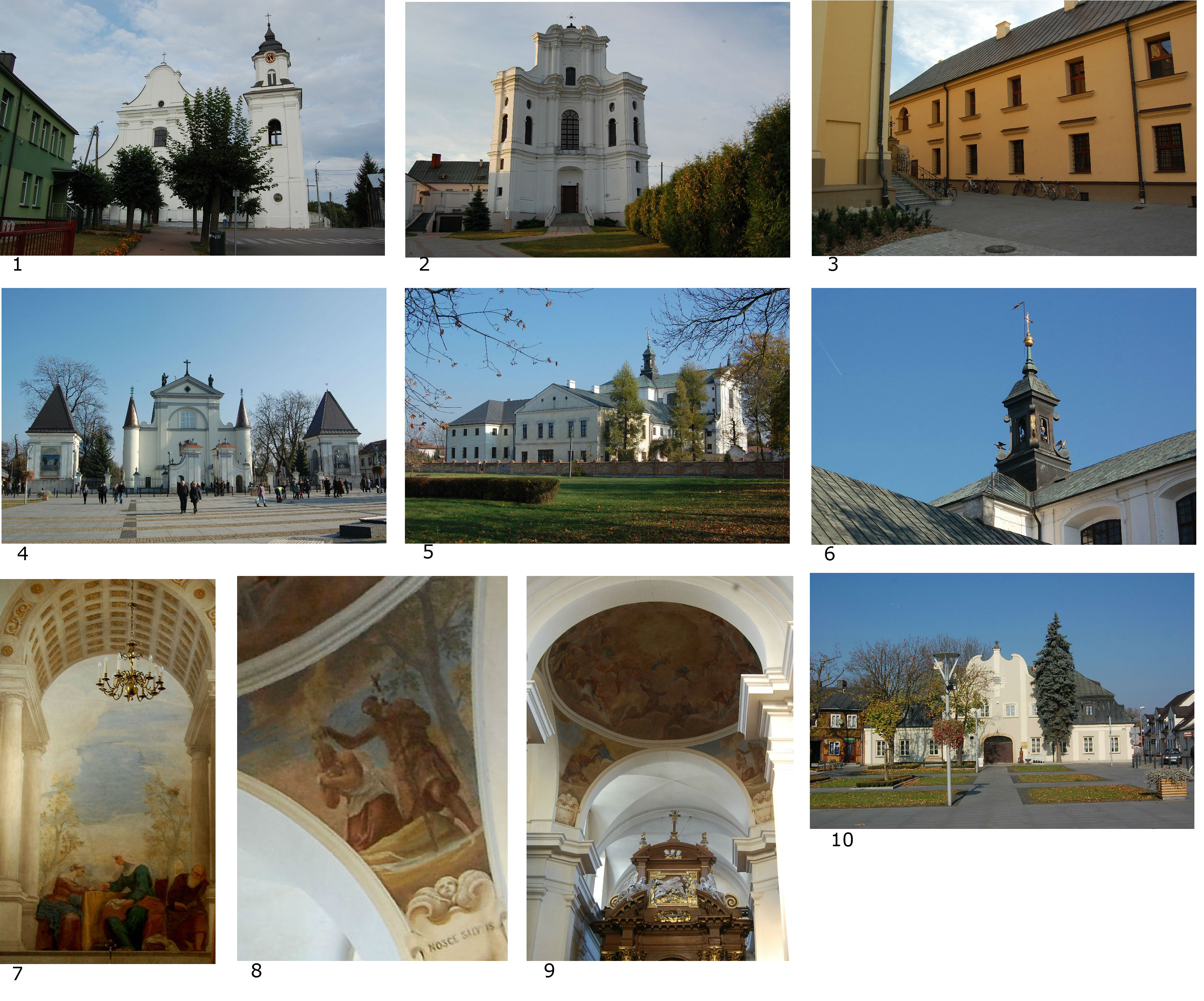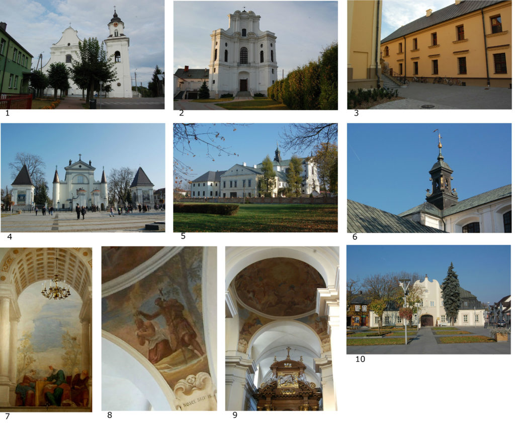 4. Na zdjęciach 7,8,9 – Wnętrza w obu kościołach zostały ozdobione Polichromią wykonaną w latach 1706-1711 przez florenckiego malarza Michała Anioła Palloniego.